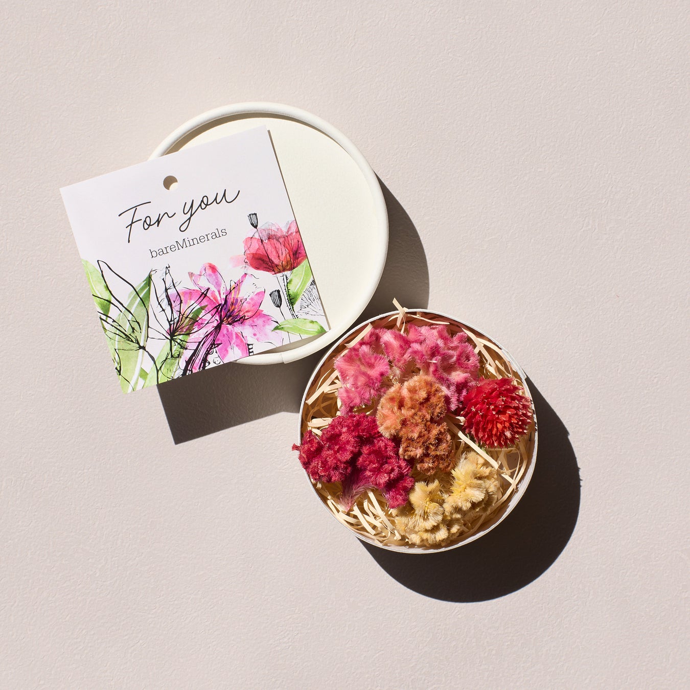 全国のベアミネラル カウンターで生まれ変わった廃棄花をディスプレイに。また限定3店舗とベアミネラル 公式 楽天市場店で、限定製品を購入するとフラワーロスをプレゼント。母の日のサステナブルなギフトにも。