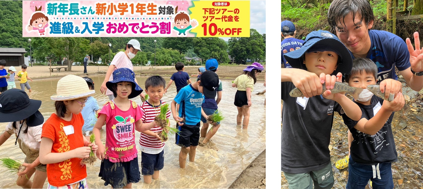 田植えに関する説明⇒田植え体験⇒昼食⇒魚のつかみどり体験⇒川遊び