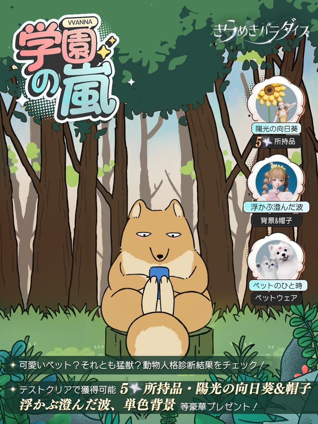 山神様からまたまたお誘いが!山神様と奇妙な冒険『学園の嵐』へ行こう!毎日一つのストーリーが解放され、サプライズプレゼントを受け取れます。性格診断を通して、あなたの魅力を探しましょう!イベントは全部で22日間。毎日無料プレゼントがありますよ。