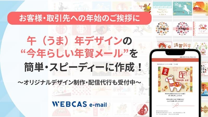 SaaSの開発・提供を通して企業や団体のCX向上を支援する株式会社WOW WORLD(ワオワールド/本社:東京都品川区、代表取締役社長:美濃 和男、以下、当社)は、本年も当社メール配信システム「WEBCAS e-mail(ウェブキャス イーメール)」を活用した年賀メール配信サービスの提供を開始いたしました。本サービスは、WEBCAS e-mailに搭載されているテンプレートや画像素材を活用し、顧客や取引先向けに年賀メールを手軽かつスピーディーに配信できるサービスです。2026年・午年の画像素材を多数ご用意しており、「今年らしい年賀メール」の作成が簡単に実現します。
