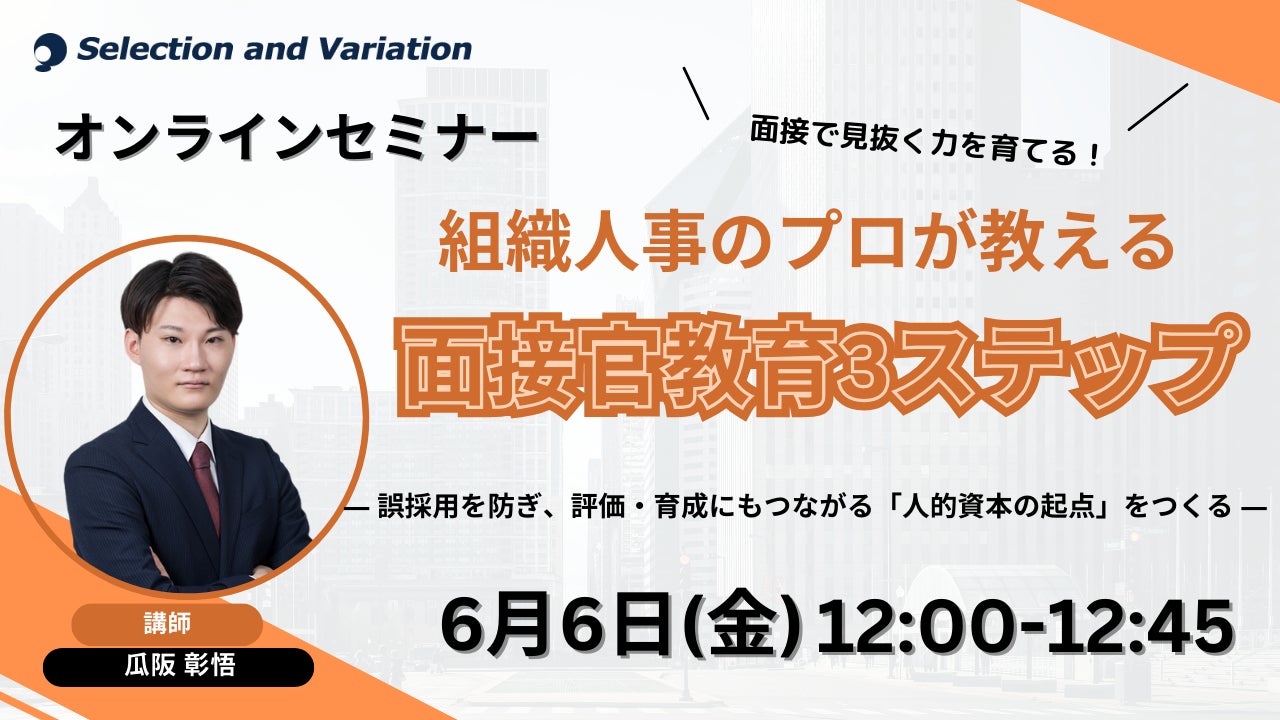 組織・人事コンサルティングファームであるセレクションアンドバリエーション株式会社(以下、当社、東京都千代田区丸の内、大阪市西区、名古屋市西区 / 代表取締役社長:平康慶浩/ URL:https://sele-vari.co.jp/ )は『面接で見抜く力を育てる!組織人事のプロが教える面接官教育3ステップ ― 誤採用を防ぎ、評価・育成にもつながる「人的資本の起点」をつくる ―』セミナーを2025年6月6日(金)12:00〜12:45に開催することをお知らせいたします。