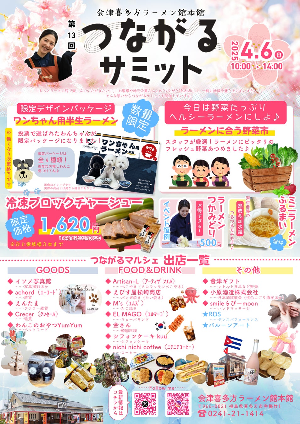 [喜多方ラーメン・お土産販売店] 株式会社河京エンタテインメント会津喜多方ラーメン館本館(本社:福島県喜多方市 取締役社長:土屋充孝)は、【第13回つながるサミット】を4月6日(日)に開催します。今回のイベントは『お客様・地域企業の皆様とつながる』をテーマに、<ワンちゃん用半生ラーメン限定パッケージ発売><ラーメンに合う野菜市><河京工場直送のラーメンつかみどり><冷凍ブロックチャーシュー特売><つながるマルシェ>など企画盛りだくさんでお届けします。