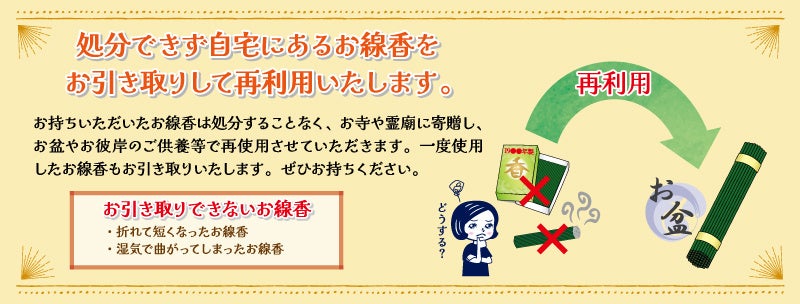 処分できず自宅に眠っているお線香をお引き取りして再利用いたします。お線香を寄贈いただいた方には仏具店の2割引チケットをプレゼント