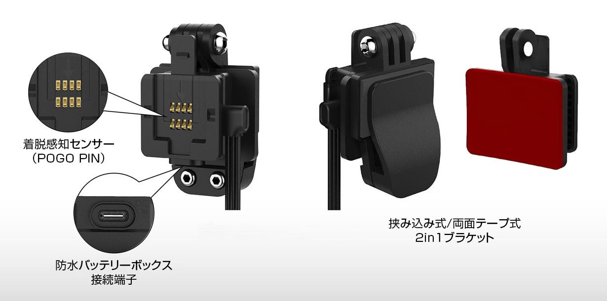 ブラケットにイヤホンと外付けバッテリーボックスも接続できるので、本体への煩わしいケーブル接続を解消します。