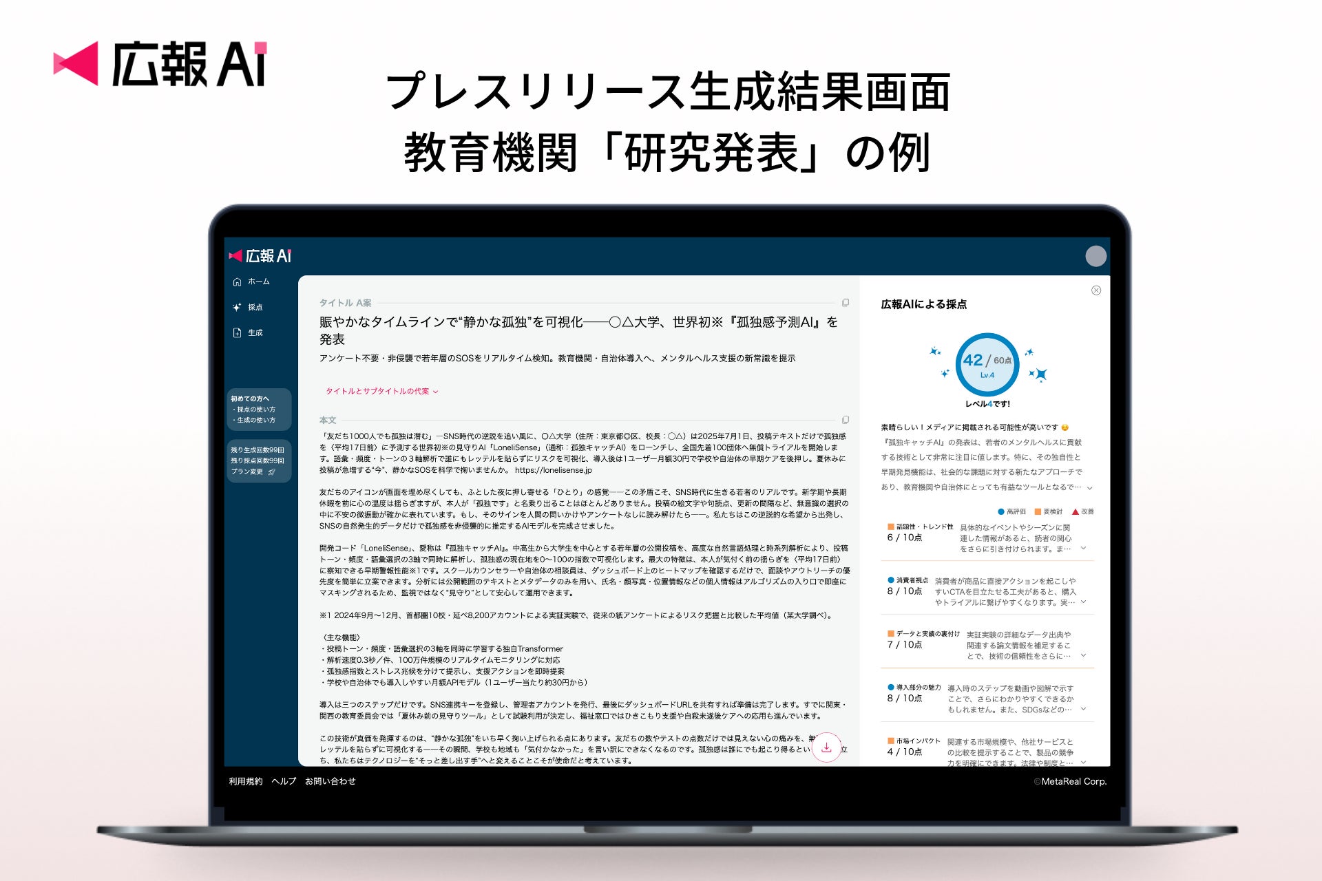業種特化の専門AI開発・運営を行うメタリアル・グループの株式会社ロゼッタ(本社:東京都千代田区、代表取締役:五石 順一)が提供する、メディアに掲載されやすいプレスリリースを生成・採点可能な『広報AI』が、大学・専門学校などの教育機関のプレスリリース作成に対応しました。学術的な研究成果や教育活動の価値を、一般社会にわかりやすく伝えるためのリリース作成を、AIがサポートします。