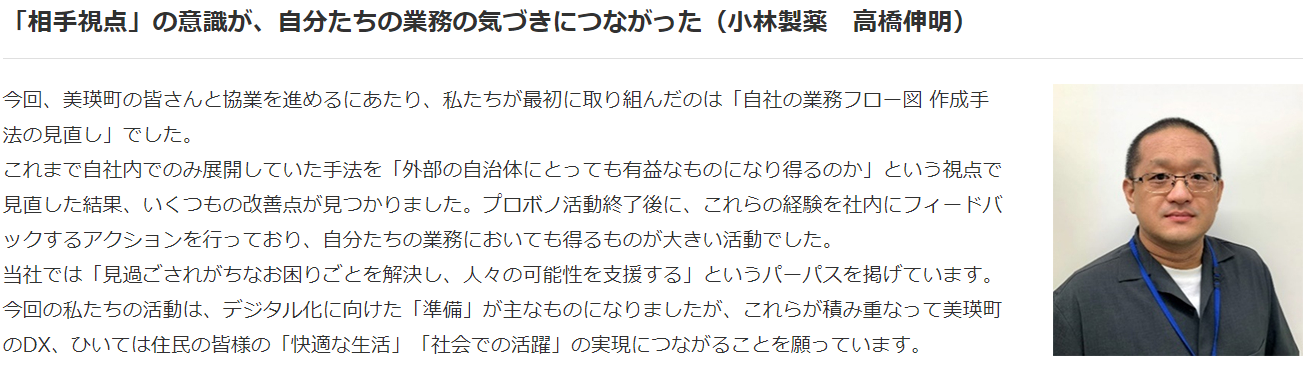 今回の活動成果を活かし、美瑛町役場においては、DXリテラシーの底上げや、デジタル技術の活用による業務効率化を図り、将来的な行政サービスの向上を目指してまいります。小林製薬においても、今後も美瑛町役場へのプロボノ活動を継続的に行ってまいります。