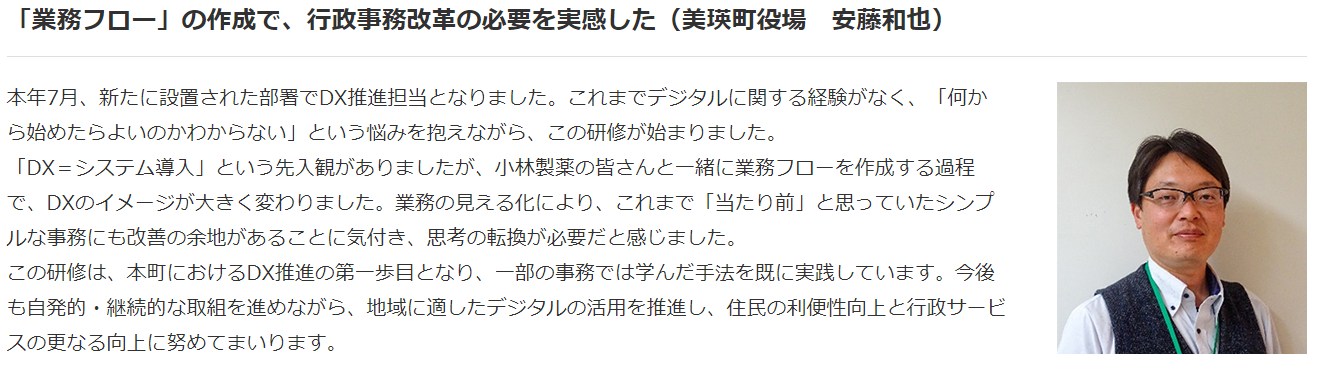 この研修は、本町におけるDX推進の第一歩目となり、一部の事務では学んだ手法を既に実践しています。今後も自発的・継続的な取組を進めながら、地域に適したデジタルの活用を推進し、住民の利便性向上と行政サービスの更なる向上に努めてまいります。