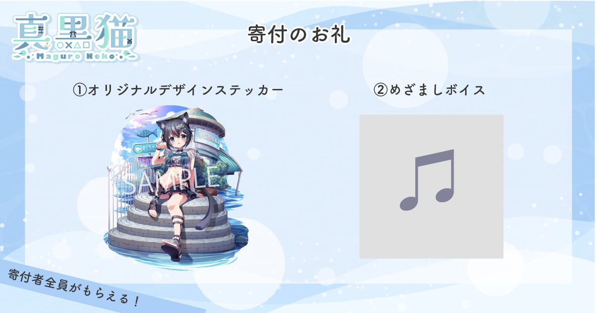 寄付サイトよりふるさと納税をした方へ寄付のお礼として今回限りの真黒猫オリジナルの目覚ましボイスとステッカーを配布いたします。