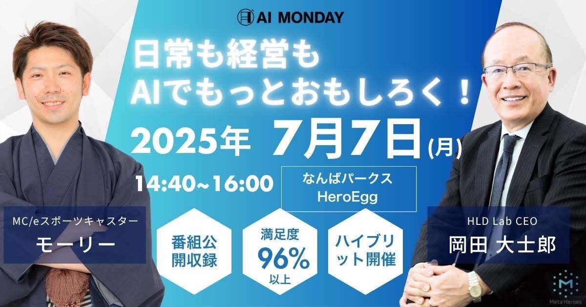 株式会社Meta Heroes(本社所在地:大阪府大阪市、代表取締役:松石和俊、以下「当社」)は、AIの最新情報と実践ノウハウを学び、異業種・多世代の仲間とともに社会の課題解決に挑戦するコミュニティイベント 「AI MONDAY」 を、2025年7月7日(月)に開催します。会場は大阪・なんばパークス「HeroEgg」、およびオンライン(Zoom)です。