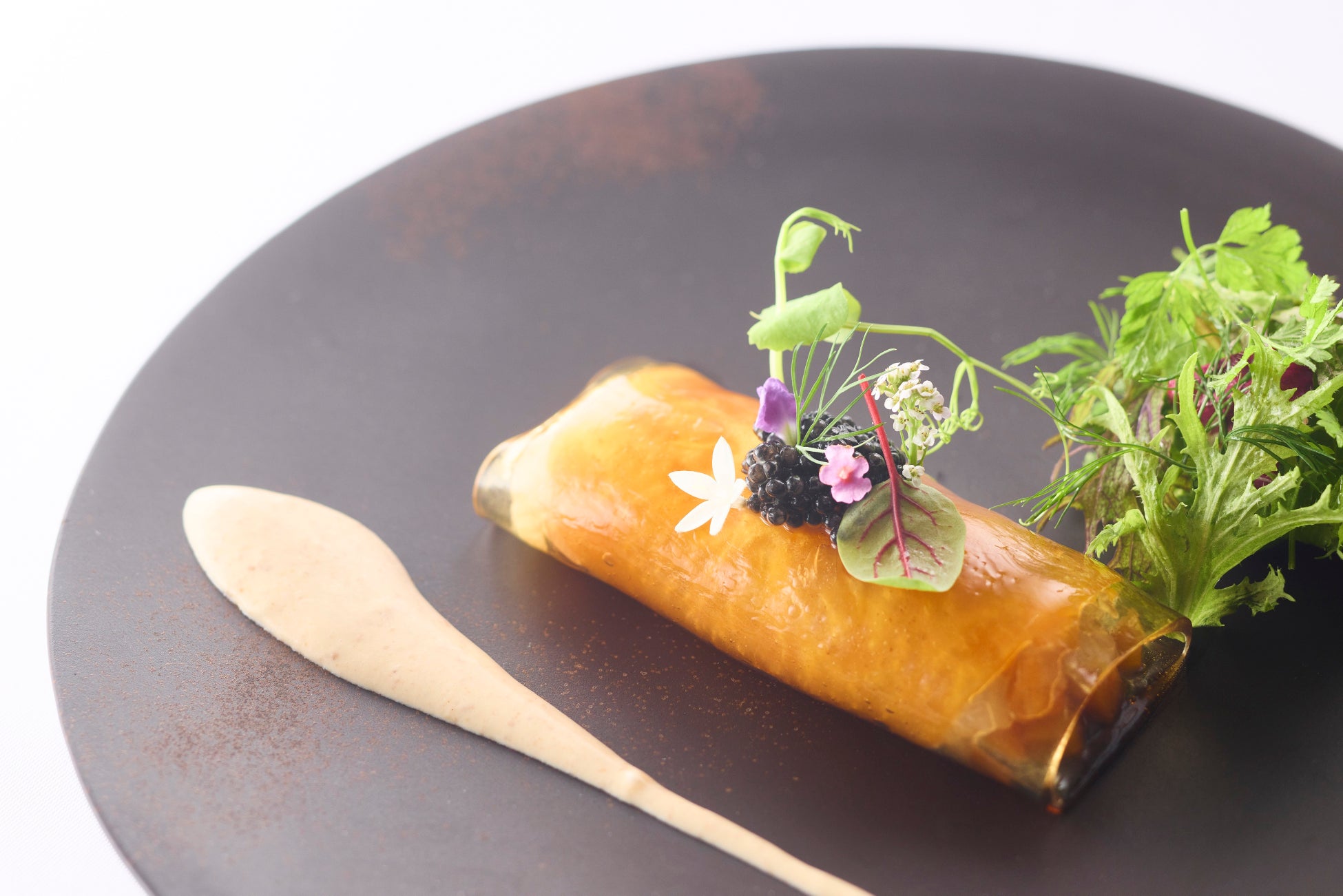 福井県産の燻し柿と自家製のリコッタチーズで作った、旨みたっぷりのソースとともに召し上がりください。秋王の橙赤色にキャヴィアとハーブが華やかさを添える見た目も美しい一品です。