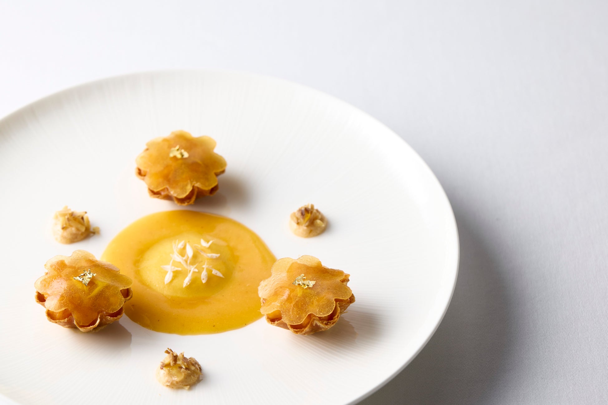 秋王のクラフティーとキャラメリゼ アッサムのエスプーマ アプリコットのアクセント