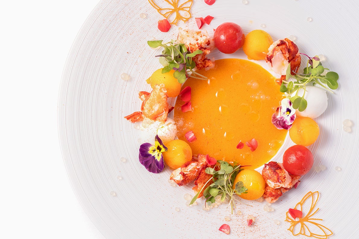 秋王の繊細な甘み、旨味、さくさくとした食感を楽しめるよう、フレッシュの秋王を使用したサラダ仕立ての一皿。オマール海老、プチトマト、水牛のモッツァレラチーズを合わせ、秋王のピューレとともに召し上がっていただきます。