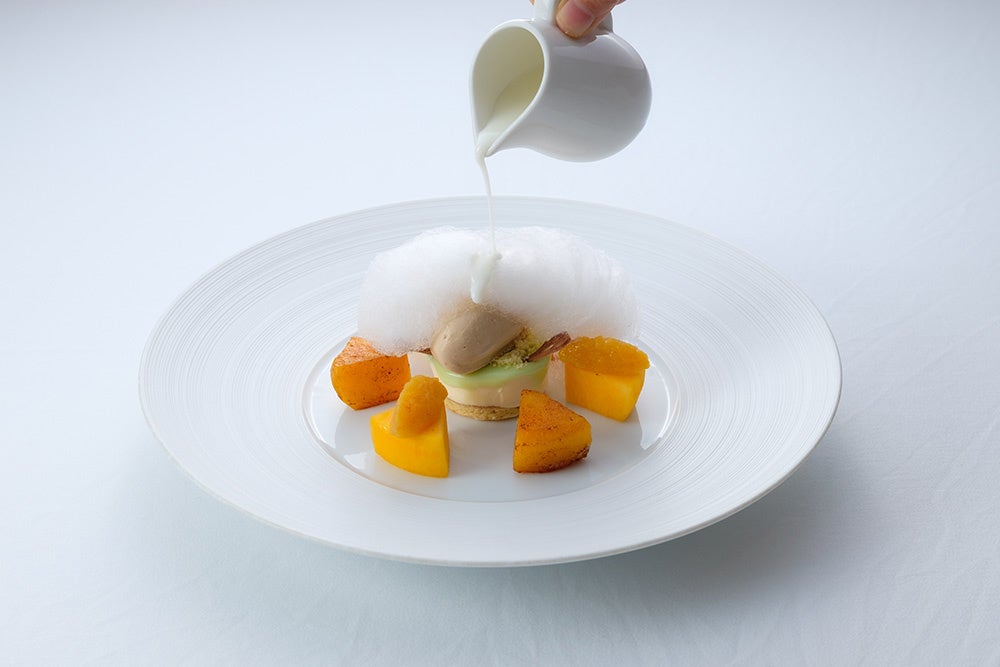 お花をかたどったタルトレットは、柿のムース、ソルベと共にフレッシュの秋王も楽しめるように"秋王のマルムラード"を忍ばせ、柿のジュレでみずみずしく仕上げました。中央には、干し柿を閉じ込めたシャンパーニュのムース。召し上がる直前に秋王のソースをかけて完成させます。