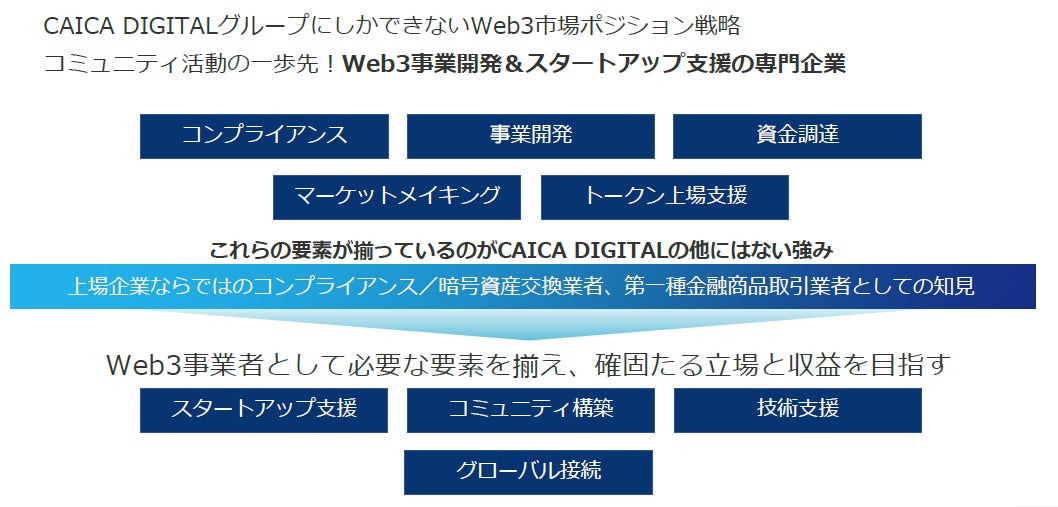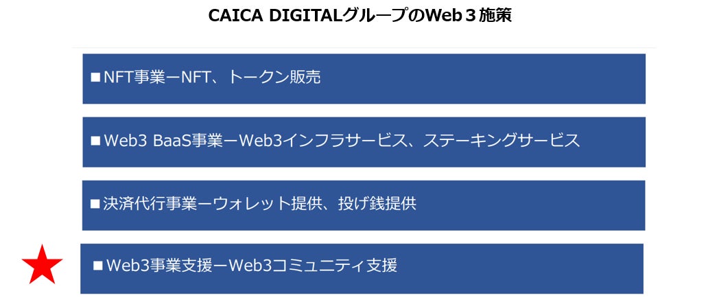 株式会社CAICA DIGITAL(本社:東京都港区、代表取締役社長:鈴木 伸、以下「当社」)はこのたび、現役web3起業家集団による日本唯一のWeb3特化コンサル企業の株式会社DeFimans(東京都港区、共同代表取締役:小野暢思・佐藤太思、以下 「DeFimans」)と業務提携契約を締結し、Web3事業支援(Web3コミュニティ支援)を共同で展開します。本業務提携は、2022年10月期決算補足説明資料にて、当社グループのWeb3施策としてお示しした、Web3事業支援(Web3コミュニティ支援)の一環となります。