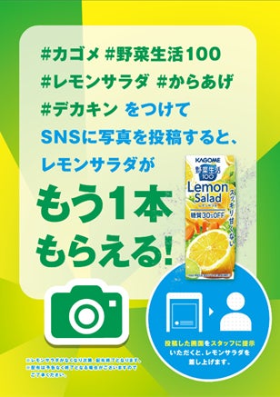 ※ご来店いただいたお客様で、その場でSNS投稿をいただいた方に、更にもう1本野菜生活100レモンサラダ200mlをプレゼントいたします。(プレゼントの数には限りがあります)