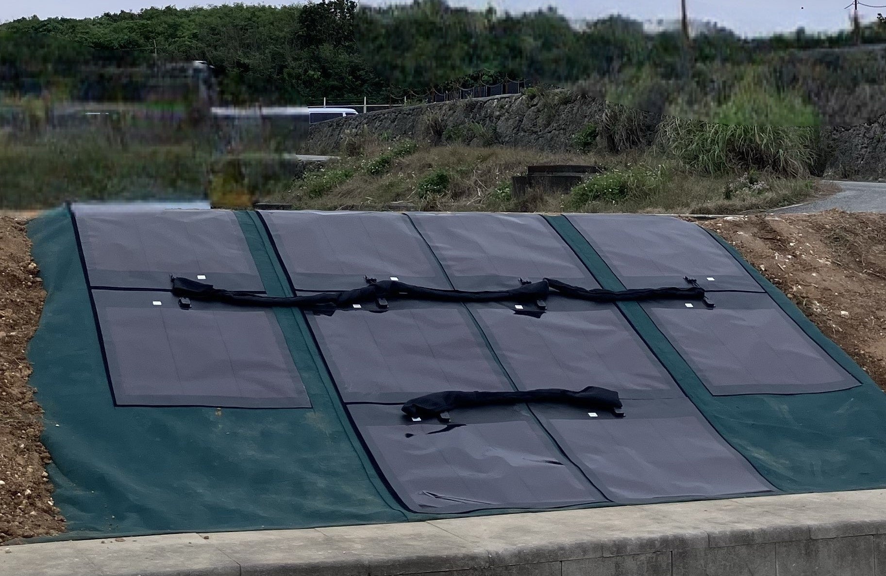 ‣台風・塩害などによる防草シートへ設置したフィルム型ペロブスカイト太陽電池 への影響評価 ‣簡易設置・施工方法の検証(施工時間4.5時間、強風対策に特殊アンカーを使用) |