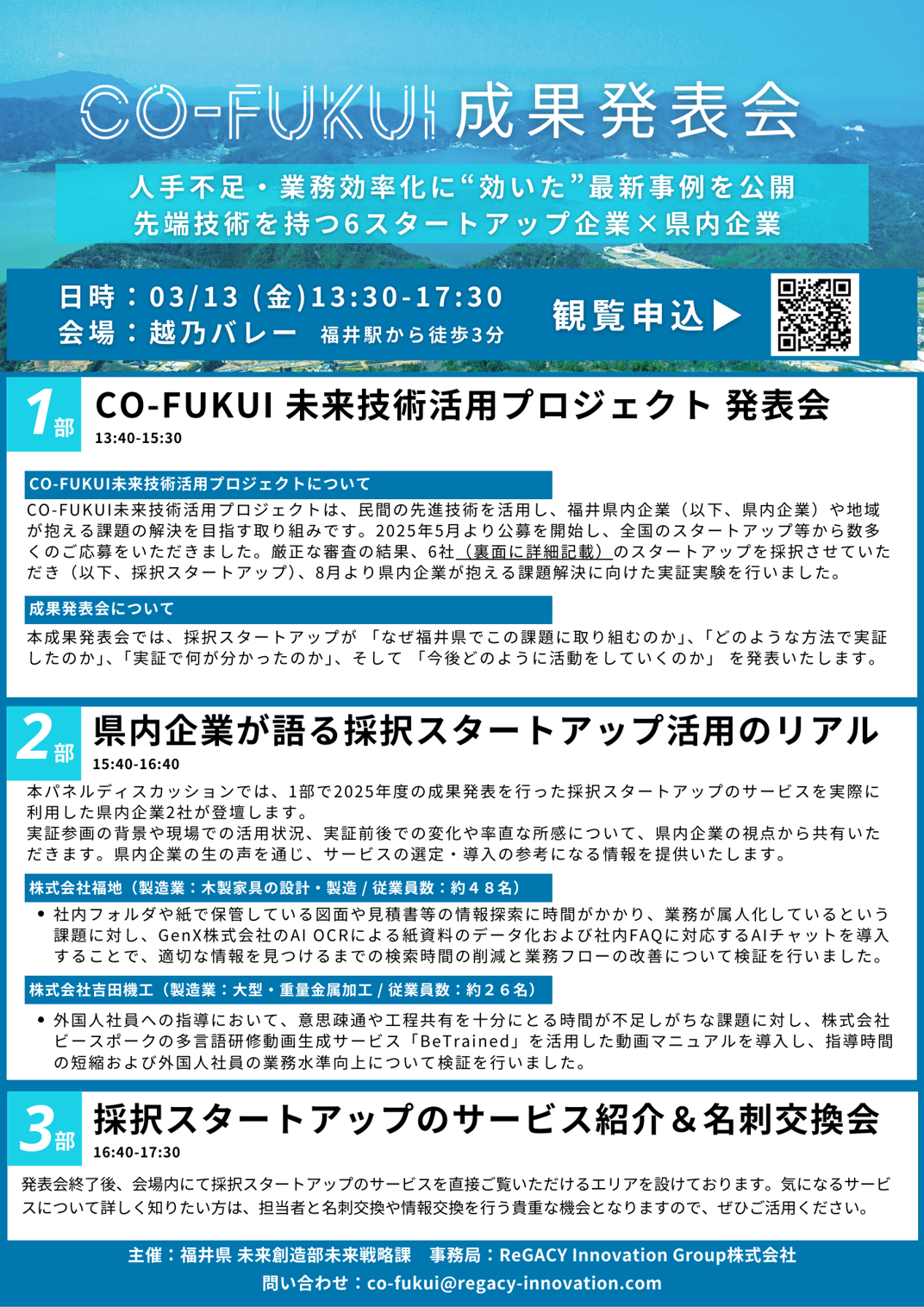 ReGACY Innovation Group株式会社(本社:東京都千代田区、代表取締役:成瀬 功一、以下:ReGACY)が事務局を務める福井県のオープンイノベーションプログラム「CO-FUKUI 未来技術活用プロジェクト(以下、本プロジェクト)」(https://co-fukui.jp/)は、2025年度プログラムの成果発表会を2026年3月13日(金)に越乃バレーで開催します。