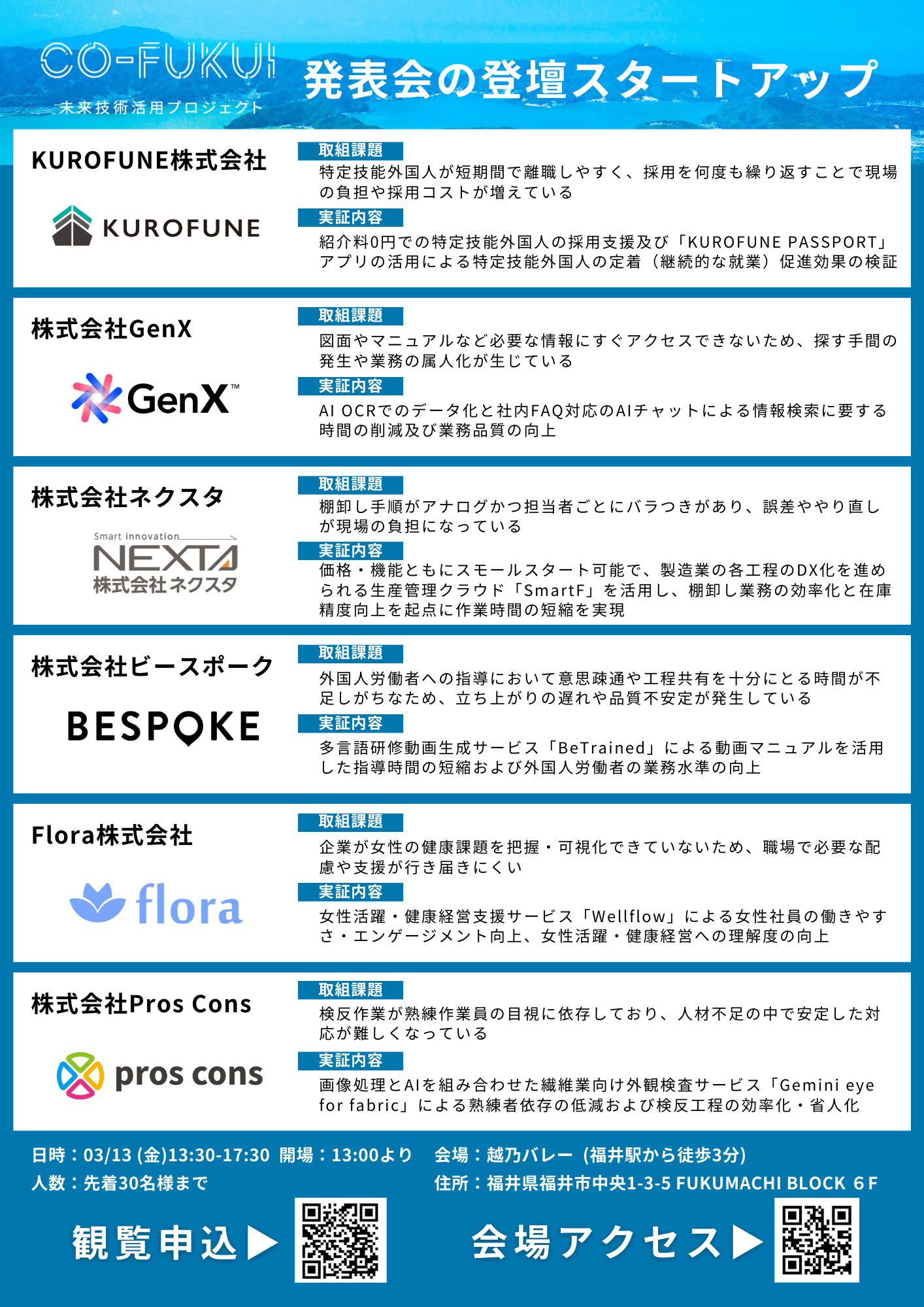 本発表会では、福井県内企業が抱える課題に対し、CO-FUKUI事業で採択したスタートアップ等(以下、採択スタートアップ)の先進技術をどのように活用し、実際にどのような成果が生まれたのかを具体的な事例とともにご紹介します。