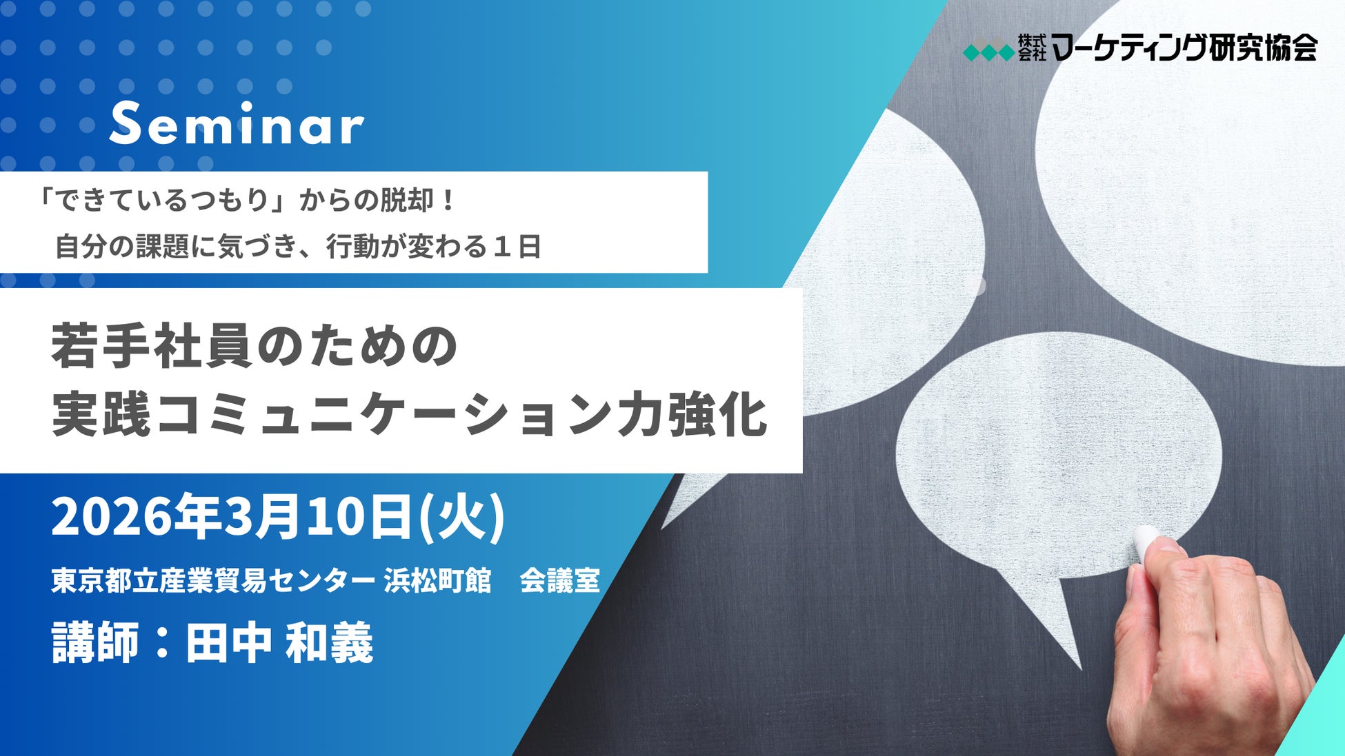 株式会社マーケティング研究協会は2026年3月10日、公開セミナー「若手社員のための実践コミュニケーション力強化「できているつもり」からの脱却!自分の課題に気づき、行動が変わる1日」を開催します。