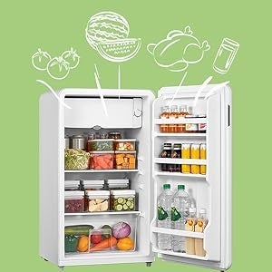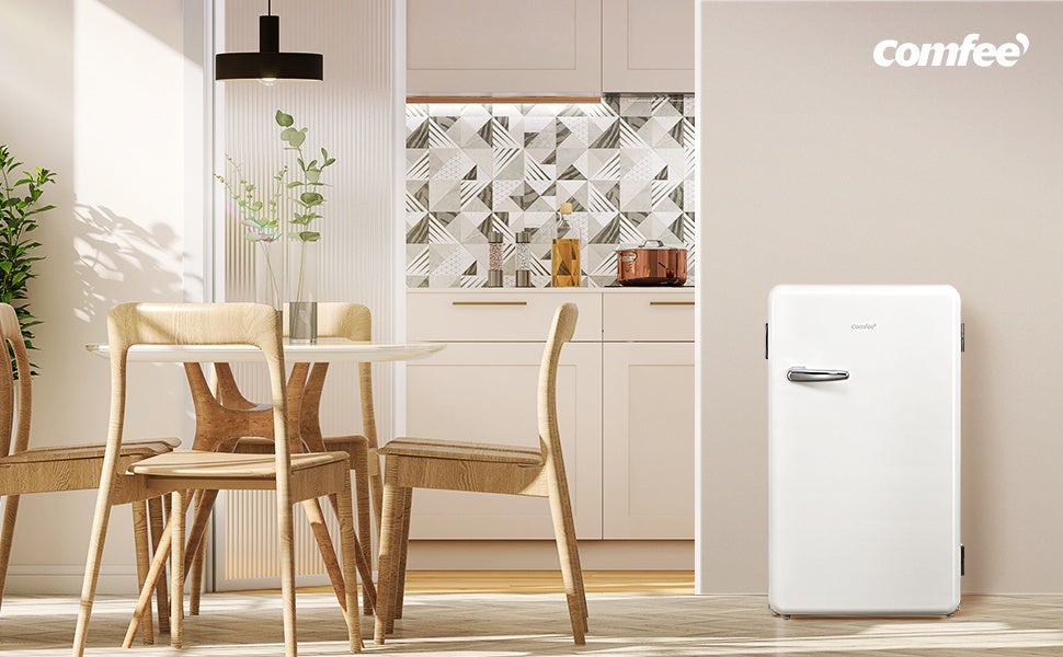 COMFEE'の93L 1ドア冷蔵庫 RCD93WHS(E)は、レトロデザインと右開き仕様で、コンパクトながら十分な収納力を持ち、キッチンにぴったりの一台です。