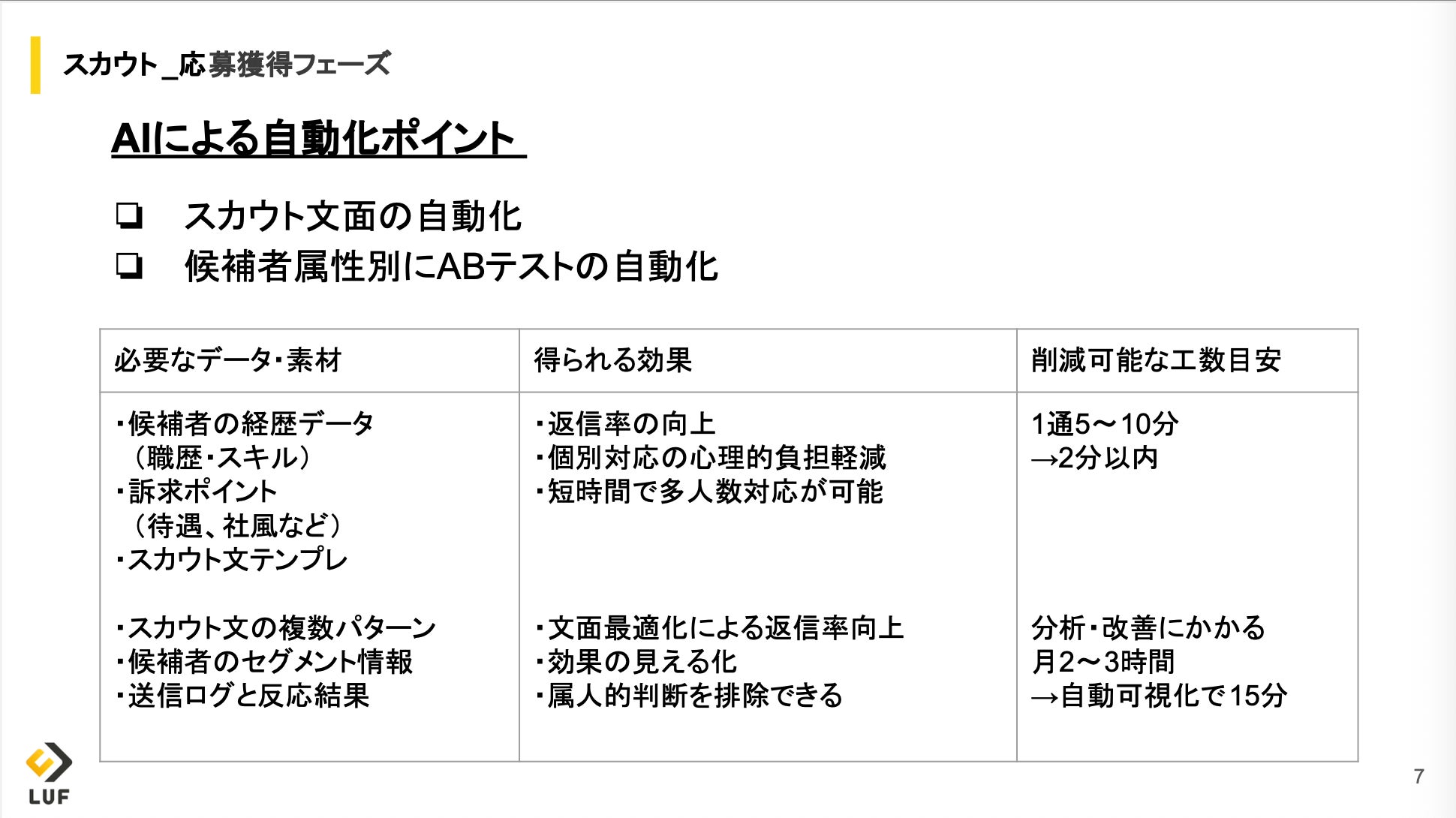 このような課題に対し、人事領域で多角的なサービスを展開するLUF株式会社(本社:東京都港区、代表取締役:堀尾 司、以下 LUF)は、採用業務の各フェーズにおけるAI活用ポイントを網羅した「採用業務のムダを炙り出す!AI導入チェックリスト」を無料で公開いたしました。