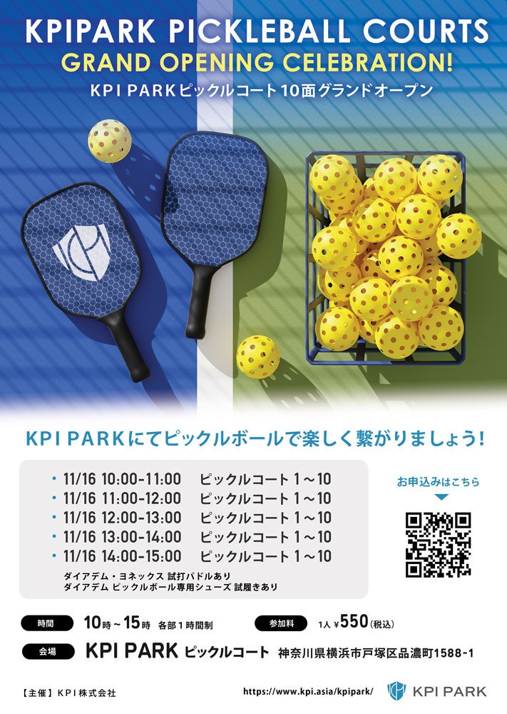 KPI株式会社(本社:東京都渋谷区、代表取締役CEO:薮田 恵士、以下KPI)は、2024年11月16日、横浜市戸塚区のスポーツ施設 KPI PARK(神奈川県横浜市戸塚区信濃町)にて、最新のピックルボールコート10面をグランドオープンします。また、この度のオープンに際し、ピックルボールを体験していただけるイベントも開催いたします。
