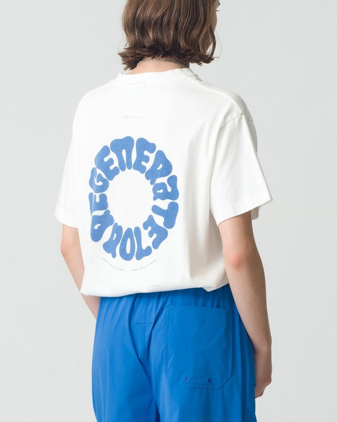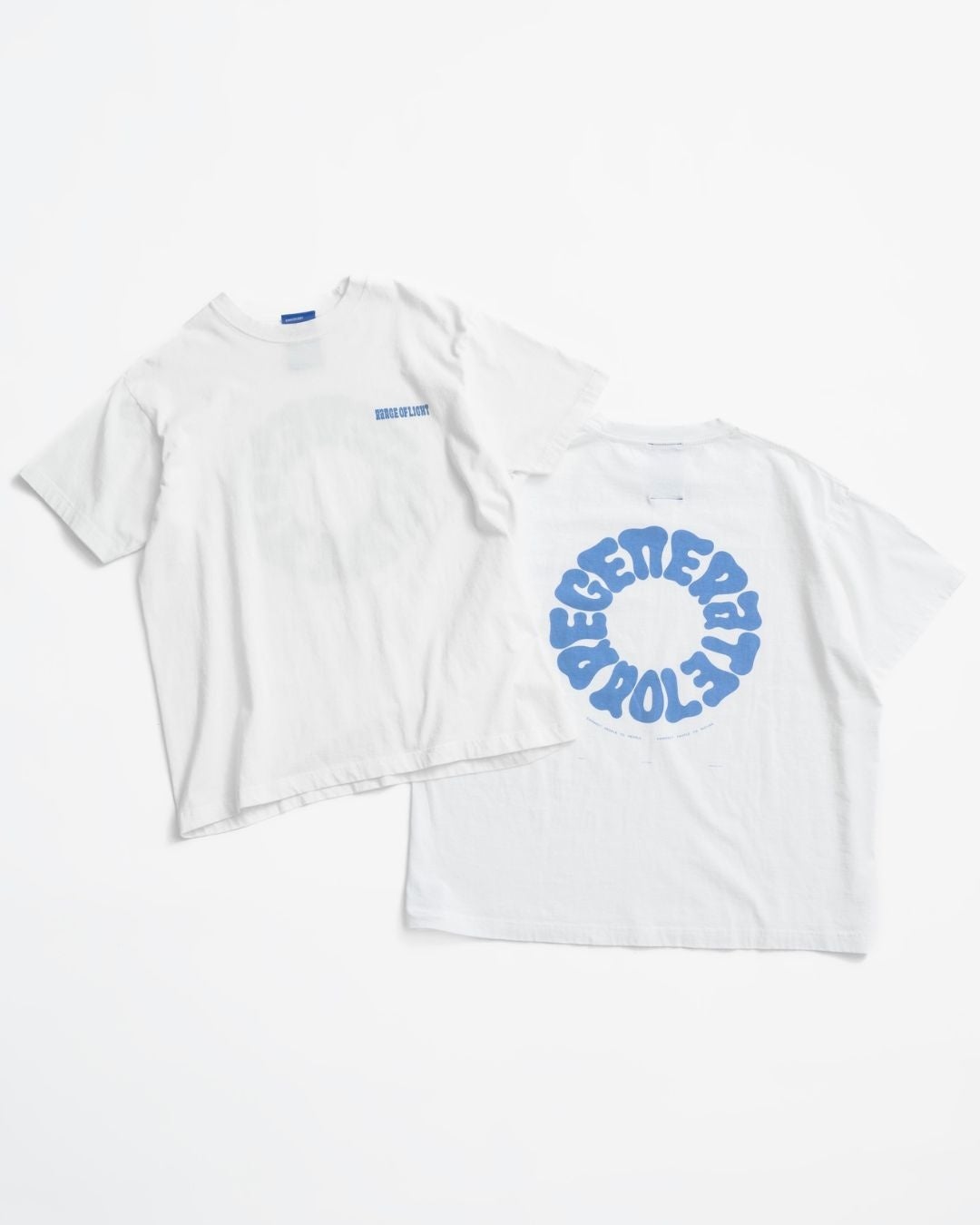 ドネーション企画より誕生した、背面にブランド名が大胆に綴られたポップなプリントTシャツ。フロントのデザインはジュエリー使いを邪魔しないシンプルなデザインに。ドネーションについては下記をご確認ください。