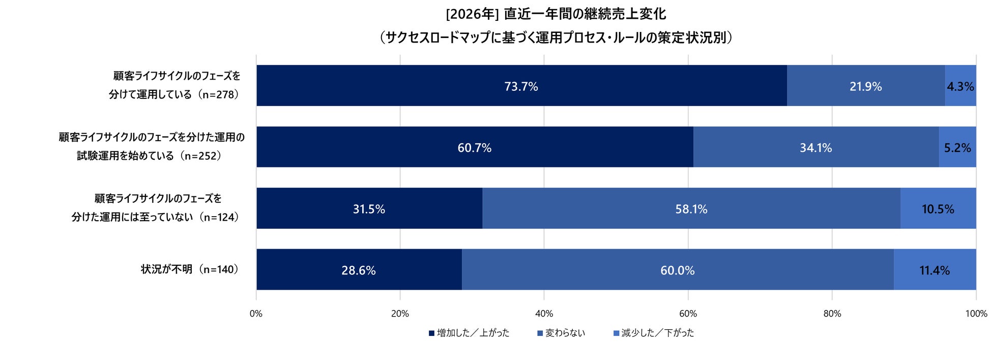 さらにこの運用プロセスは、主観的な効果体感だけでなく、客観的な業績数値にも劇的な差をもたらしています。フェーズ分け運用を行っている層では73.7%が直近一年間の継続売上の増収を実現している一方で、フェーズ分け運用に至っていない層では半数以上が「変わらない」と回答しています。