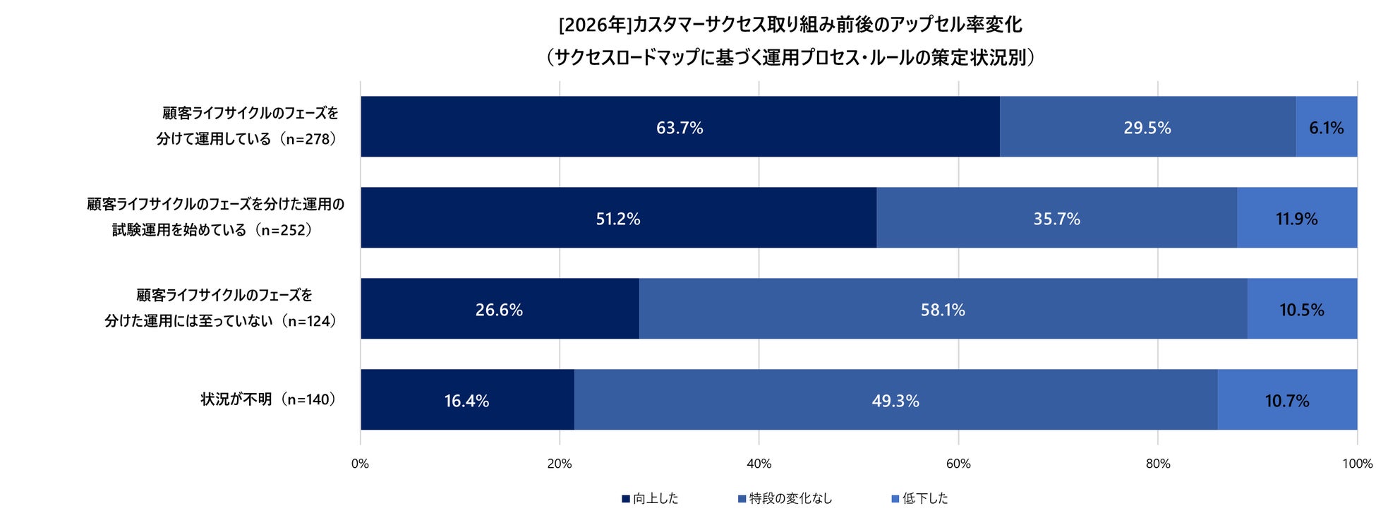 さらに、カスタマーサクセス取り組み前後におけるアップセル率の変化について、フェーズ分け運用を行っている層の63.7%が「向上した」と回答しており、フェーズ管理によって顧客の成長段階が可視化されることで、顧客の状況に即したプロアクティブな提案が収益を最大化させる「攻めの武器」として機能している実態を裏付けています。