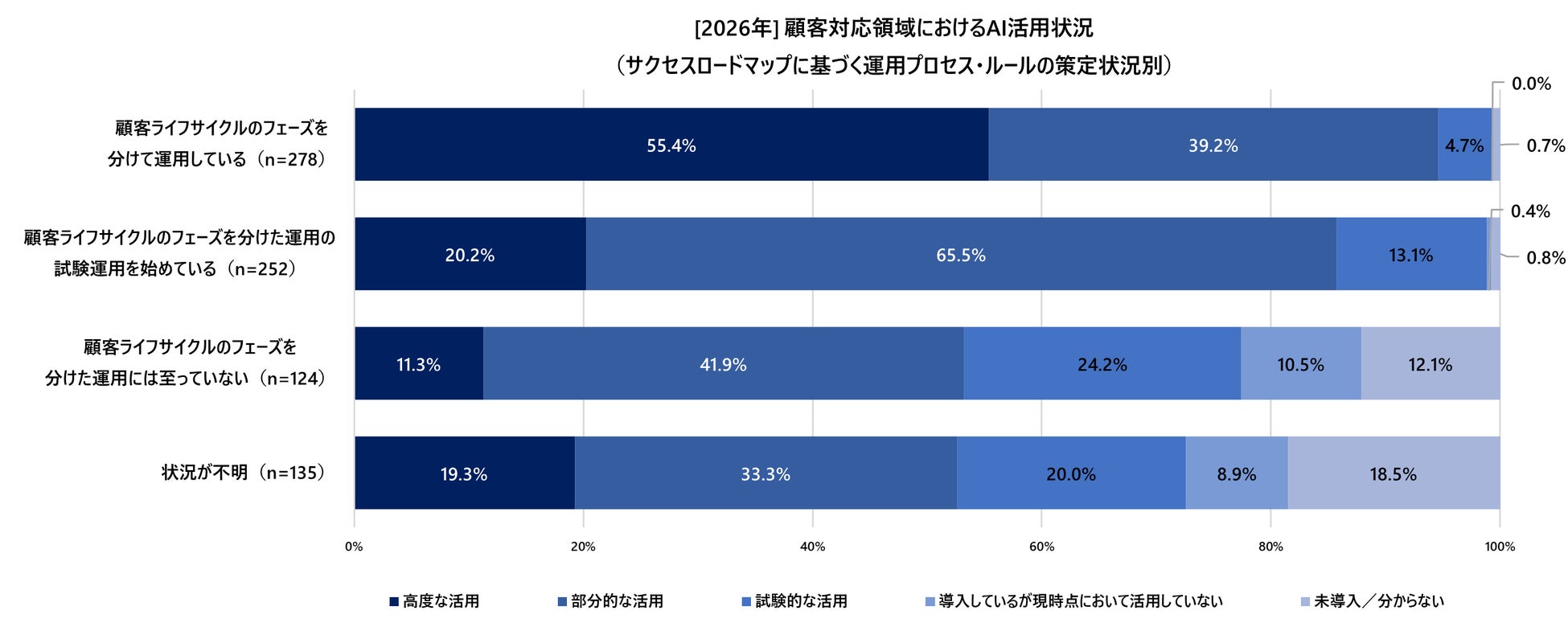 運用ルールが確立された企業では、AIの高度な活用が20.2%から55.4%へと、2.7倍という、急速な伸びを記録しています。これは、顧客対応の型が確定したことで、どの工程にAIを組み込み、どのような判断を委ねるべきかという戦略的確信が得られた結果と考えられます。運用ルールの確立は、テクノロジーのポテンシャルを実務成果へと変換するための、実質的な「起動条件」となっています。