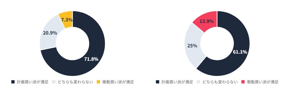 全体の約71.8%が「計画買いは満足度が高い」と回答。しかし、現在の生活幸福度が「非常に高い」層に限ると、衝動買いに満足感を見出す割合が全体の約1.9倍(13.9%)に跳ね上がる結果に。