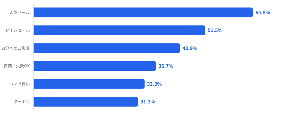 20代はSNS・インフルエンサー合計が47.6%と高く、日常的に流れてくる動画や投稿が購買に直結。一方、50代はSNS関連の影響が21.8%に留まる一方、大型セールイベントやタイムセールをきっかけにした「攻略型」スタイル(合計81.8%)が主流で、お得な条件を賢く使いこなす世代間の購買スタイルの違いが鮮明になりました。