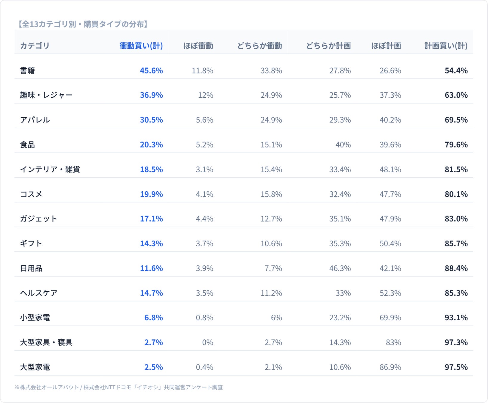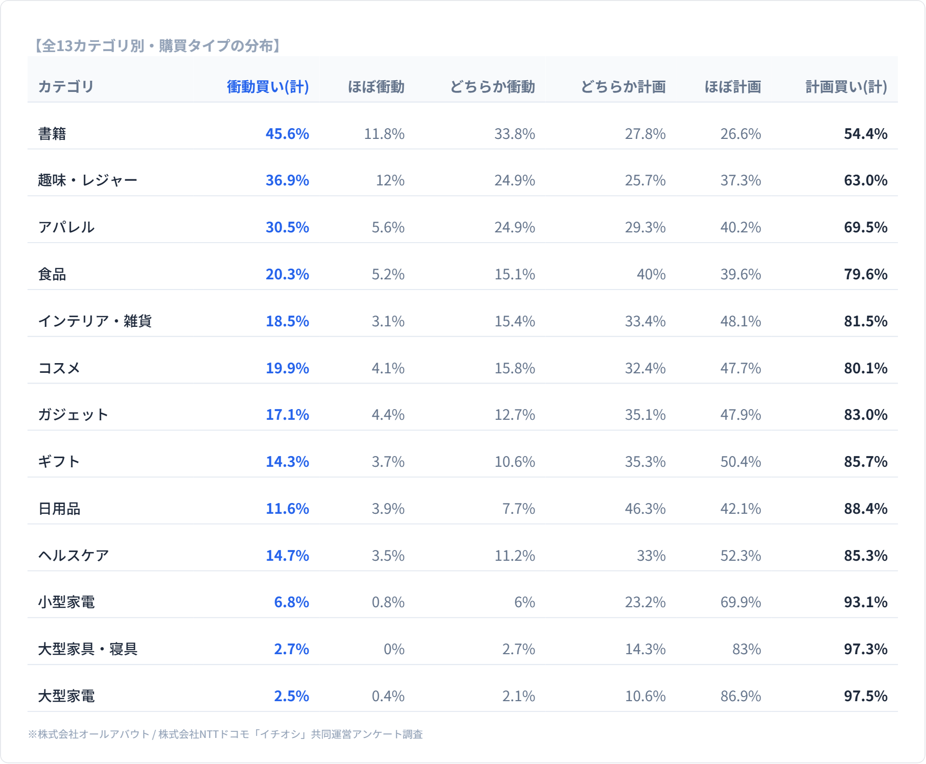 大型家電(97.5%)、大型家具・寝具(97.3%)では計画買いが圧倒的多数。金額の高さや設置スペースの制約といったリスクが、消費者の直感を完全に抑制していることがデータから実証されました。