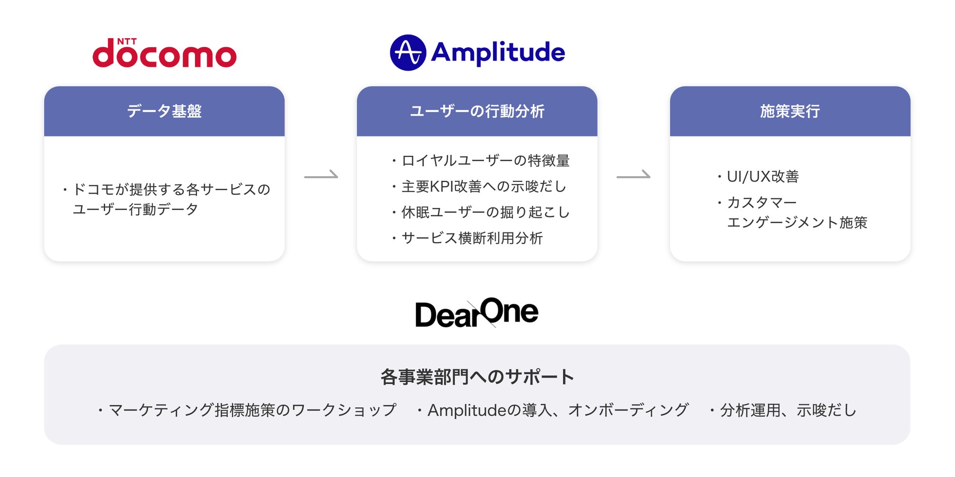 また、AmplitudeとDearOneはドコモの各事業部門へ伴走支援を行い、グロース、データの民主化を進めていきます。