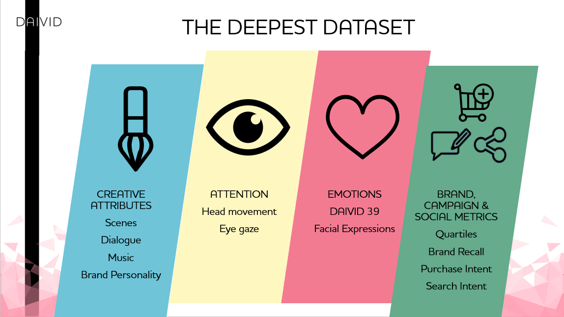 AIを活用した広告調査プラットフォーム。PCおよびモバイルデバイス上で動画を被験者に見せ、ウェブカメラを通じて、顔表情分析、アイトラッキングや先駆的な感情分類手法であるDAIVID 39などの一連の先進技術を使用し、広告主が広告キャンペーンによって生じる感情的影響と注目を最適化するのを支援するサービス。