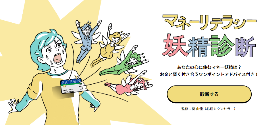 5つの質問に答え、心に住むマネー妖精(4パターン)を診断。質問には性格診断に加え、マネーリテラシー度を確認する問題を組み込み、診断された妖精ごとにお金と賢く付き合うアドバイスを提供します。
