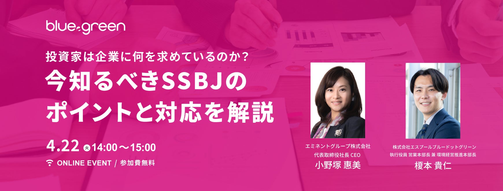 株式会社エスプールブルードットグリーン(本社:東京都千代田区、取締役社長:八林公平)は、2025年4月22日(火)14:00から、「投資家は企業に何を求めているのか?今知るべきSSBJのポイントと対応を解説」 ウェビナーを開催します。