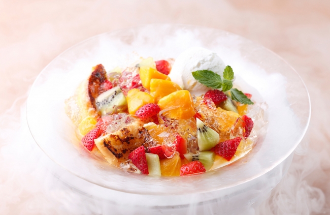 ドライアイスでキンキンに冷やした器に、冷やしたフレンチトースト、マンゴー、キウイ、苺などの果実とパッションジュレ、キラキラのクラッシュゼリーとジャージーア イスを盛り付けたひときわクールな一皿!