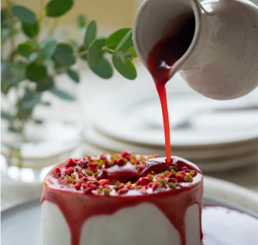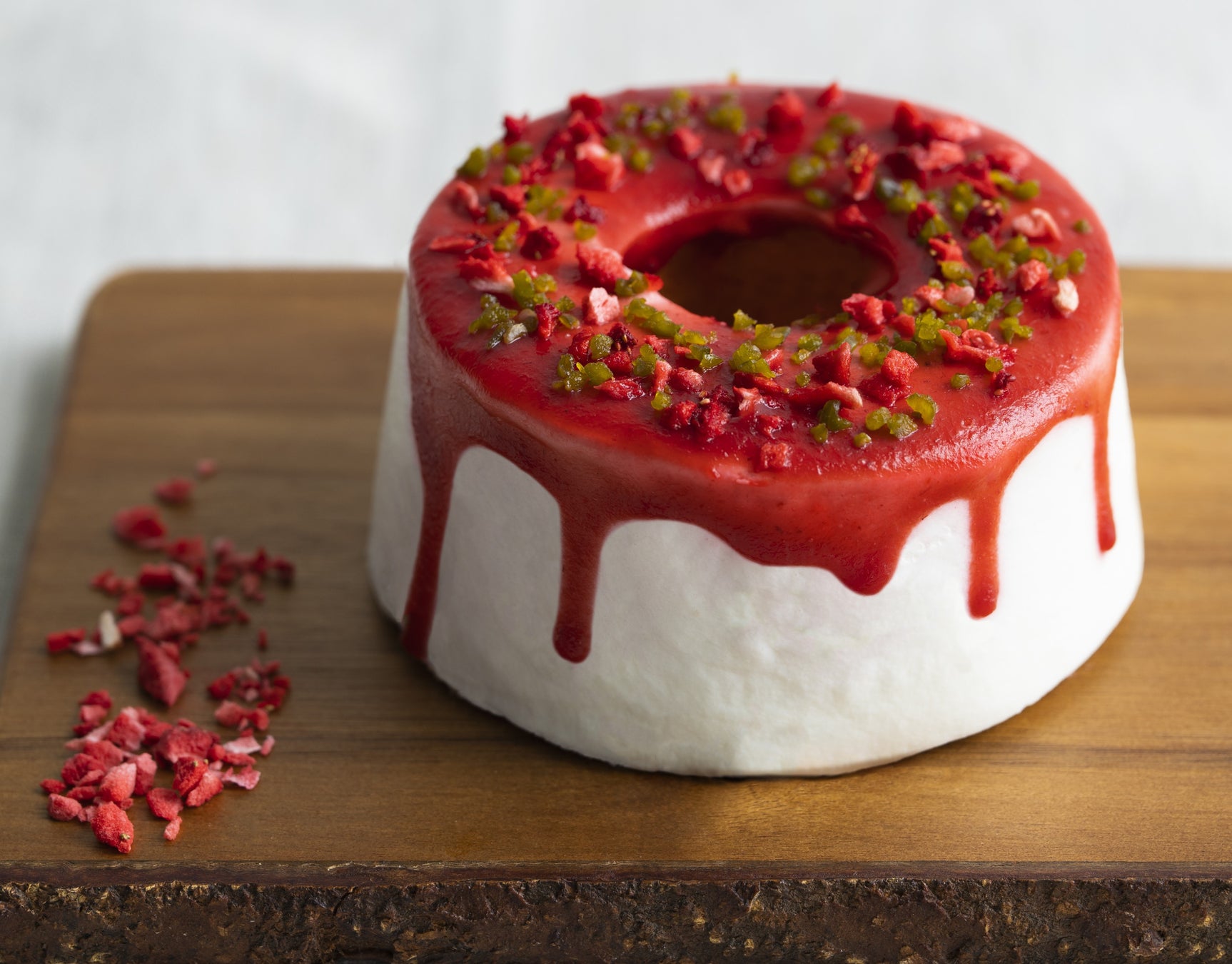 シフォンケーキにかかるのは、苺とフランボワーズを使用した甘酸っぱいベリーソース。甘くなりすぎないよう、隠し味にラム酒を少量加え、すっきりとした味わいに仕上げました。フリーズドライの苺と刻んだピスタチオをトッピングし、甘さ控えめの生クリームでコーティングしました。また、生地に苺の果肉を練りこむことで、ふんわりとした苺の香りと柔らかな果肉の食感を楽しんでいただけます。