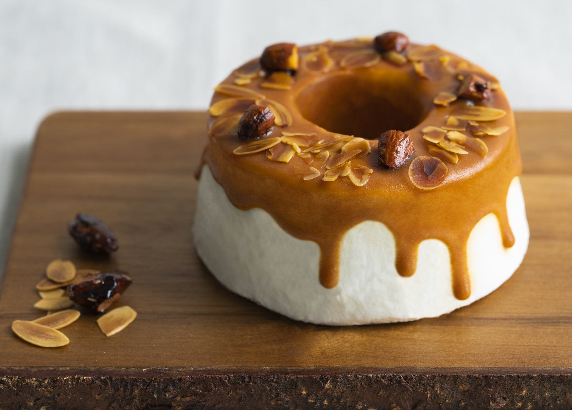 シフォンケーキにかかるのは、濃厚でほろ苦いキャラメルソース。甘さ控えめの生クリームとの相性が良くなるよう、職人が吟味調整したオリジナルのソースをかけて仕上げました。トッピングにスライスとキャラメリゼした二種類のアーモンドを使用し、芳ばしい香りとサクサク・カリカリ食感がやみつきになる一品です。