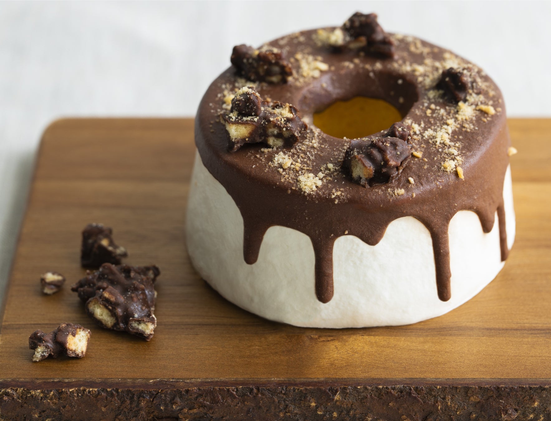 「もちっとしっとり」としたシフォンケーキの生地にガーナ産のチョコレートを練り込みカカオの深みのある濃厚な味わいに仕上げました。上にかかるのはフローラルでフルーティーな味わいが特徴のエクアドル産のチョコレートソース。濃厚ながらもすっきりとした後味を楽しんでいただけます。