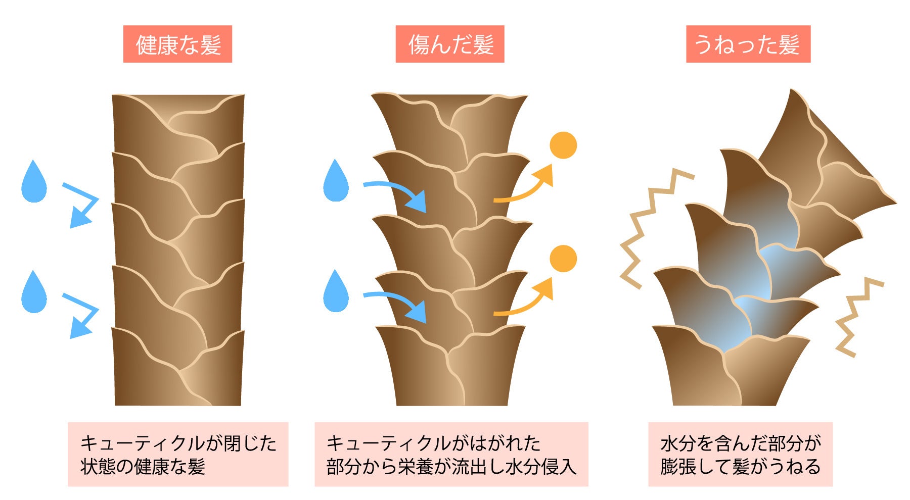 髪内部のタンパク質、水分などのバランスが取れた髪は艶、弾力をキープできますが、カラーリングやパーマ、ドライヤーやヘアアイロンの熱、紫外線、摩擦などがダメージとなりキューティクルがめくれたり、剥がれ落ちると、その隙間から内部成分が流出。パサつき、切れ毛、うねりが出てツヤを失うことに。