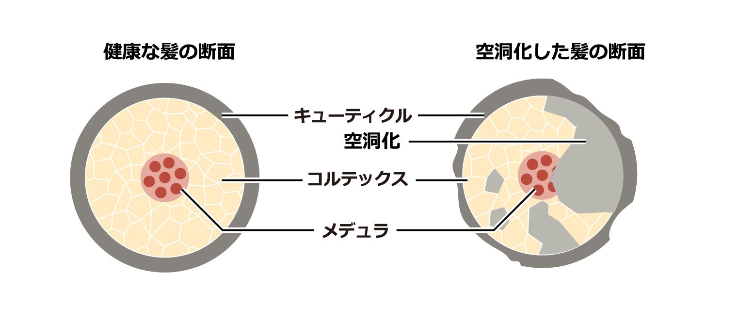 生卵を沸騰したお湯に入れるとゆで卵になるように、髪のタンパク質も高温にさらされると部分的に熱変性を起こして空洞ができ、硬くなります。