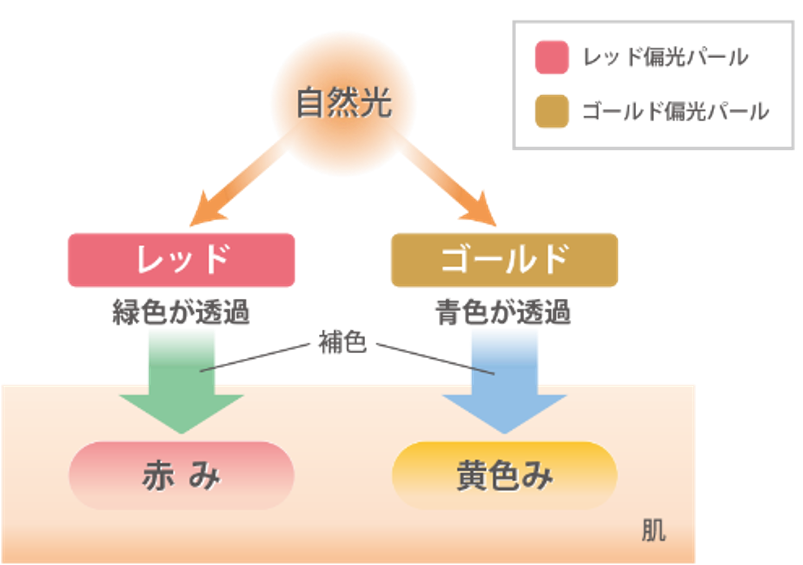 〈トーンアップ UV モイスト〉は、「ゴールド」と「レッド」の 2 色の偏光パールを配合しています。 レッドパールは、自然光を浴びると赤色の光を反射させ、緑色の光を肌に透過。肌の赤みを打ち消して透明感のある肌へ仕上げます。 ゴールドパールは、自然光を浴びると黄色の光を反射させ、青色の光を肌に投下し、黄ぐすみ、茶ぐすみをカバーします。