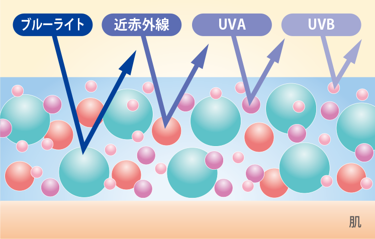 「SPF50+ PA++++」で、UVA、UVB は最高レベルのカット力を発揮。加えて、 近年肌老化の大きな原因といわれており、肌の奥深くまで入り込んでシワの原因になるといわれるディーブ UV(近赤外線・ブルーライト)もしっかりカットします。 また、4 種類の大きさの違う粉体で、最先端の光カットを備えていながら、 ノンケミ処方で肌への優しさも同時に実現しました。