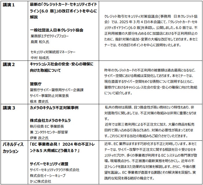 しかし、多くのEC事業者は日常業務に追われる中で、ガイドラインの理解や具体的な対策まで取り組むことが難しいという現状があります。そこで本セミナーでは、ガイドライン策定の事務局を務める日本クレジット協会やクレジットカード不正利用に対し様々な取り組みを実施されている警察庁などをお招きし、ガイドライン全体の解説と対策について分かりやすく解説いただきます。