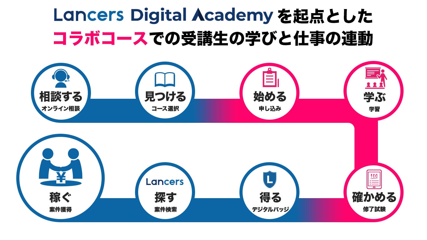 各コースでスキルを習得した後、ランサーズデジタルアカデミーが設定する条件を満たした方へデジタルバッジを付与することで、「学び直し」から「仕事獲得」までの機会を提供してまいります。