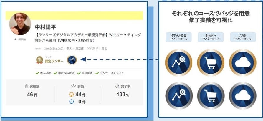 「ランサーズデジタルアカデミー」は学ぶだけではなく、仕事連動型のコースを展開しております。受講修了試験にて、高評価を得た受講生には「Lancers」において、プロフィールページにスキルバッジを付与します。バッジはゴールドバッジ・シルバーバッジの2種類があり、評価に応じて付与し、スキルの可視化をすることでフリーランスの方の仕事獲得や報酬拡大をサポートします。自社調べによると、デジタルバッジを保有し、約1年間活動した方は、獲得報酬額が平均235%増加している結果も表れております。(※)