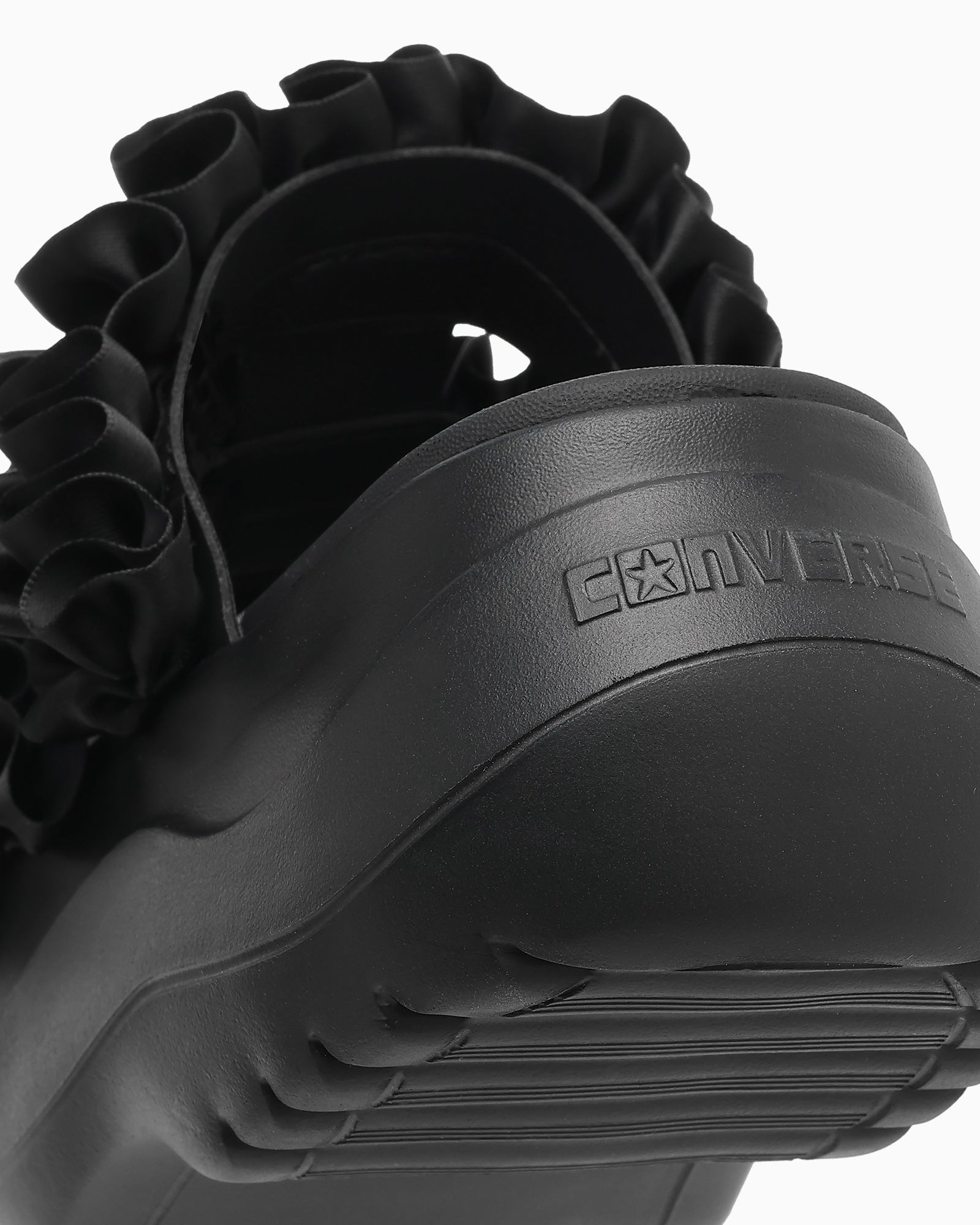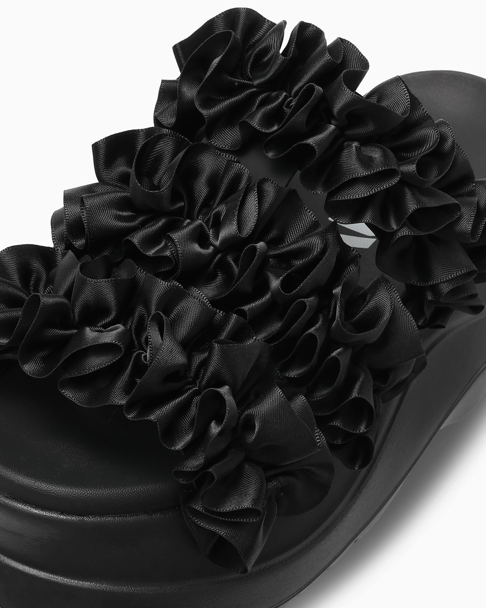 アッパーにはたっぷりとあしらったフリルを採用し、スタイリングの主役になるガーリーなデザインに仕上げています。コーディネートに取り入れやすいワントーンのブラックカラーで展開。厚みのあるアウトソールによるスタイルアップ効果に加え、柔らかなPU素材のフットベッドとE.V.A.のアウトソールを組み合わせることで、履き心地にも配慮した一足です。
