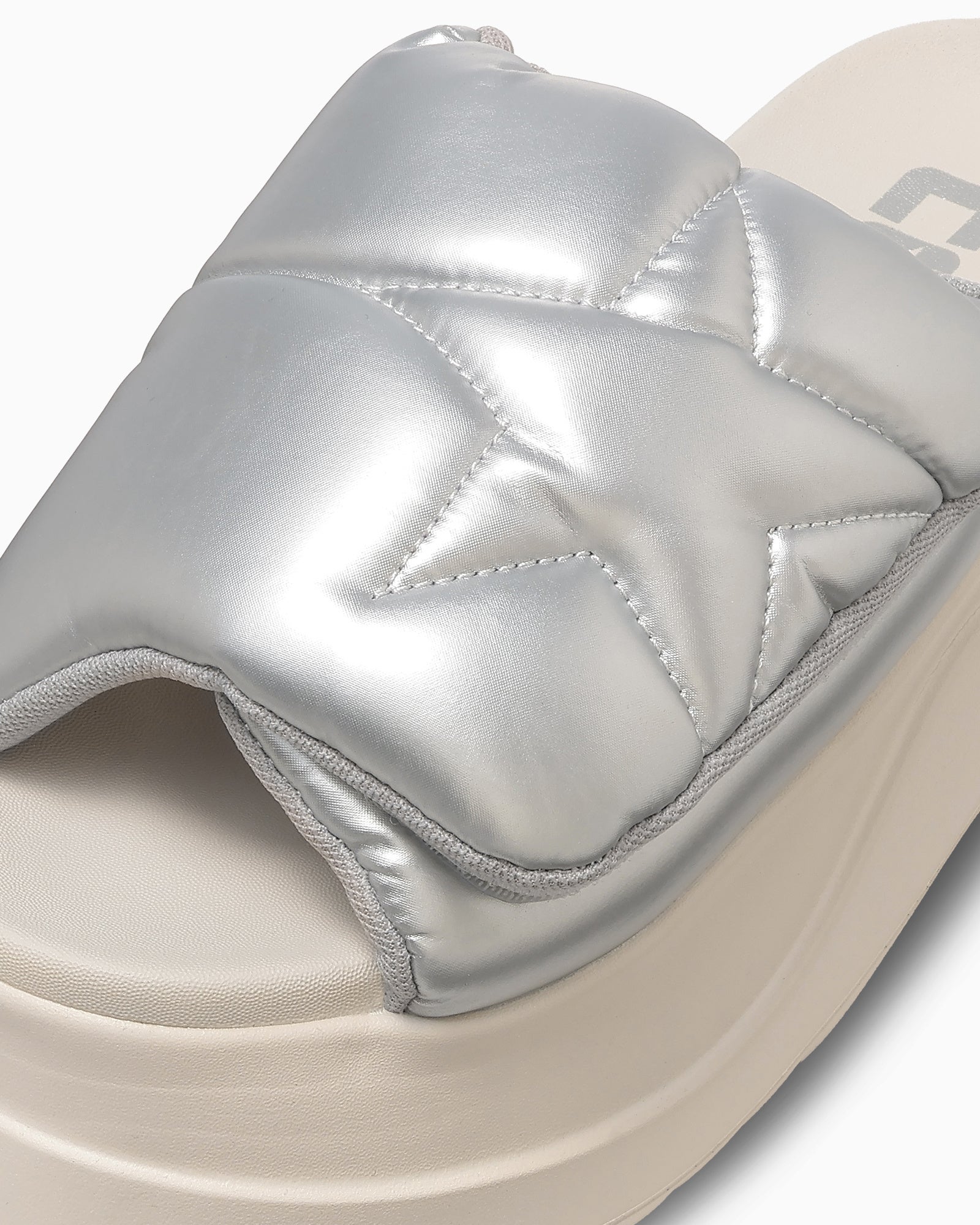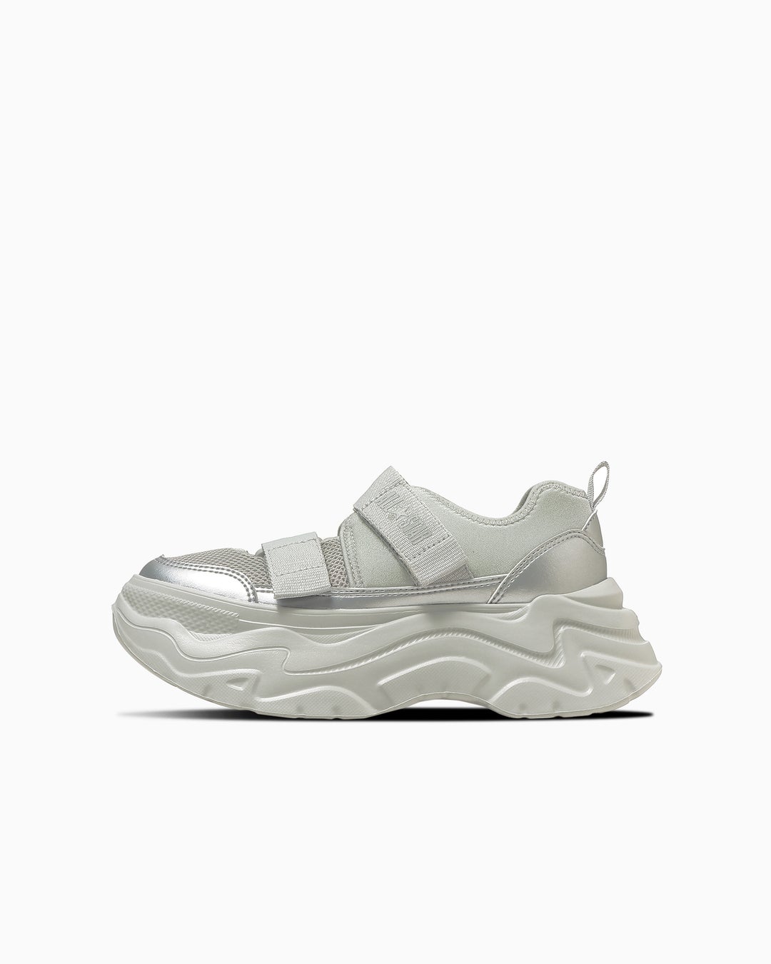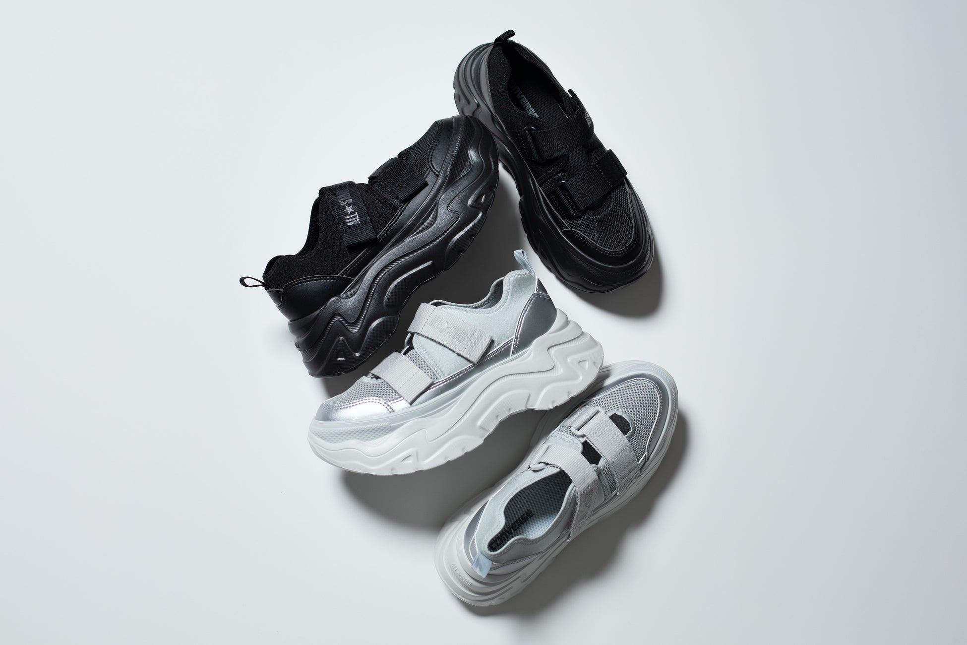 アッパーにはパフ感のある素材を採用し、マジックテープ仕様によりフィット感の調整が可能です。足を包み込むような履き心地に仕上げています。さらに、大きく配した星の刺繍とシルバーおよびブラックのメタリックなナイロン素材により、存在感のあるデザインに仕上げています。厚みのあるアウトソールによるスタイルアップ効果に加え、柔らかなPU素材のフットベッドとE.V.A.のアウトソールを組み合わせることで、履き心地にも配慮した一足です。